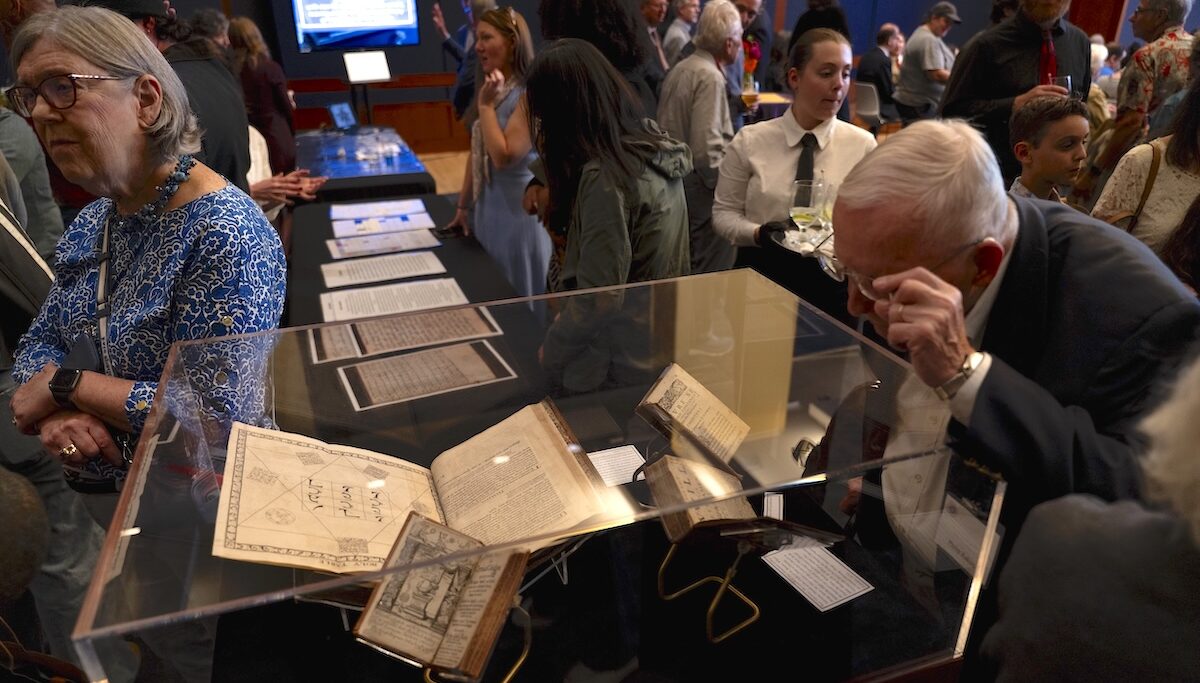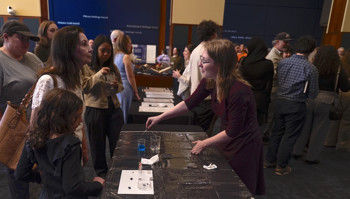 As part of the Institute’s Rohm and Haas Fellow in Focus lecture series, former Institute scholars Megan Piorko and Meagan Allen greeted guests at the “Producing the Philosophers’ Stone” table. Piorko had attendees try their hand at solving the first line of a 17th-century ciphertext containing a partial recipe for creating the legendary substance, which alchemists believed could turn base metals like lead and iron into gold. Allen demonstrated how she made an amalgam from mercury and gold while a video of her smelting the element antinomy in a lab looped on a video screen.