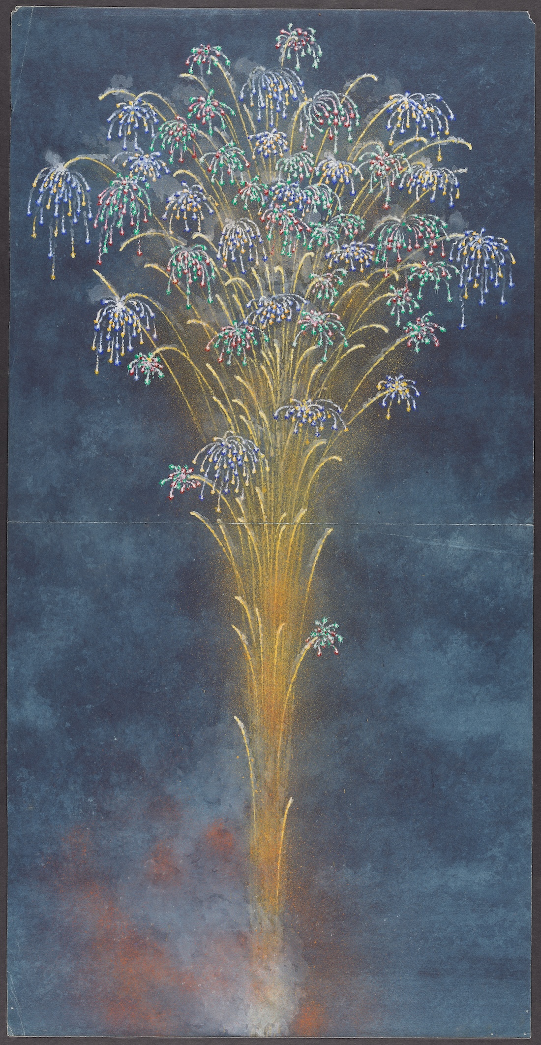 This section of Flash! Bang! Boom! considers historic approaches of storytelling through fireworks, which were used as theater with elaborate papier-mâché architecture and floating objects studded with different types of pyrotechnic elements. Visitors will see beautiful gouache paintings circa 1890 that represent different moments in these performances.