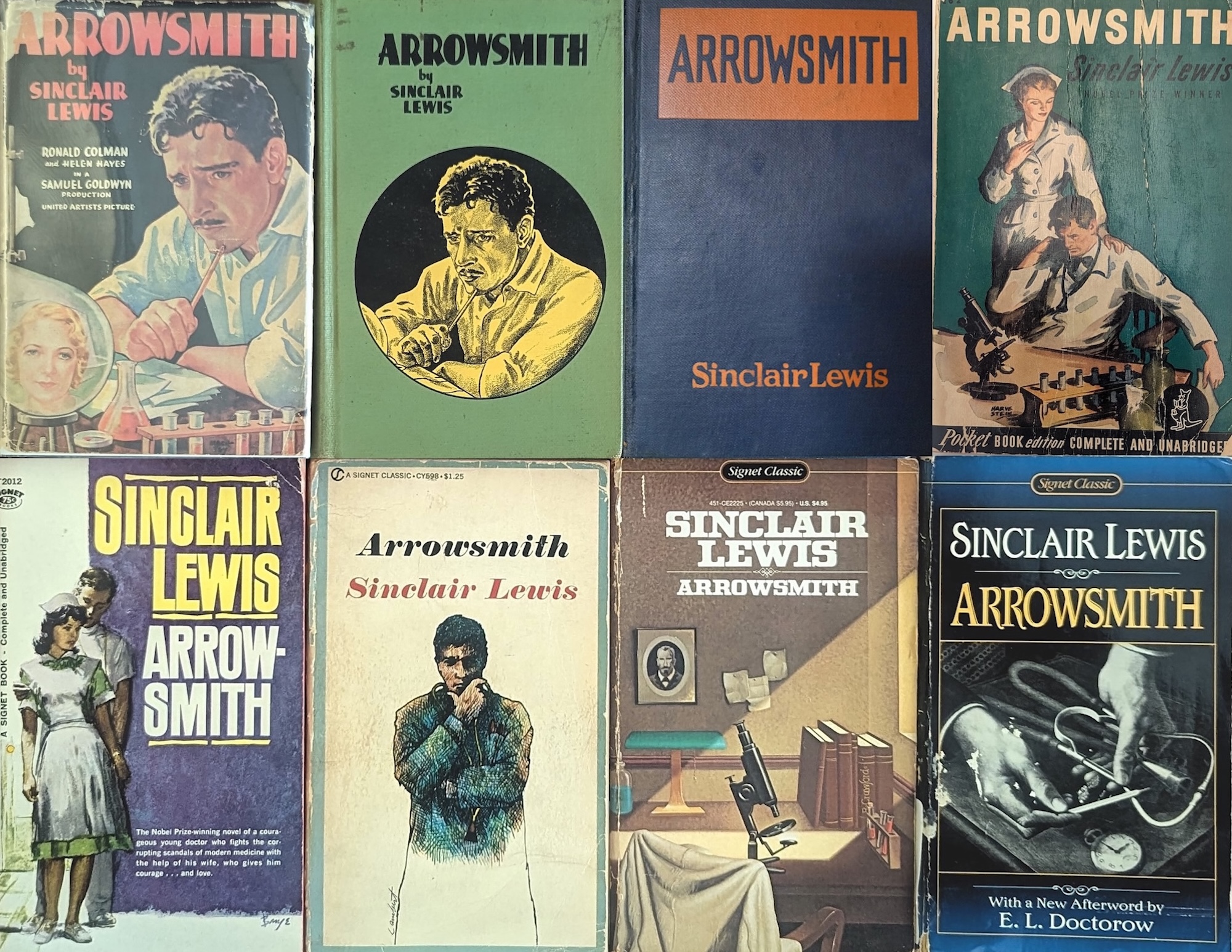 Featured image: Various editions of Sinclair Lewis’s Arrowsmith (1925), dating from 1931 to 1998. Many of the cover illustrations use similar images, such as laboratory glassware, stethoscopes, microscopes, a doctor, and a nurse.